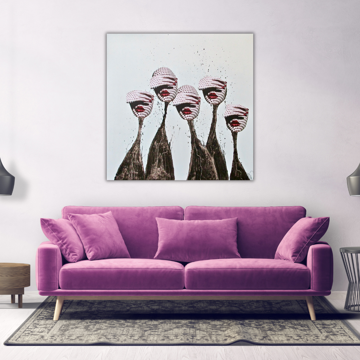 Deze patronen roepen een gevoel van stoïcisme en uniformiteit op, terwijl ze een hypnotiserende vibratie uitstralen. Het meest opvallende element is ongetwijfeld de felrode mond van elke figuur.